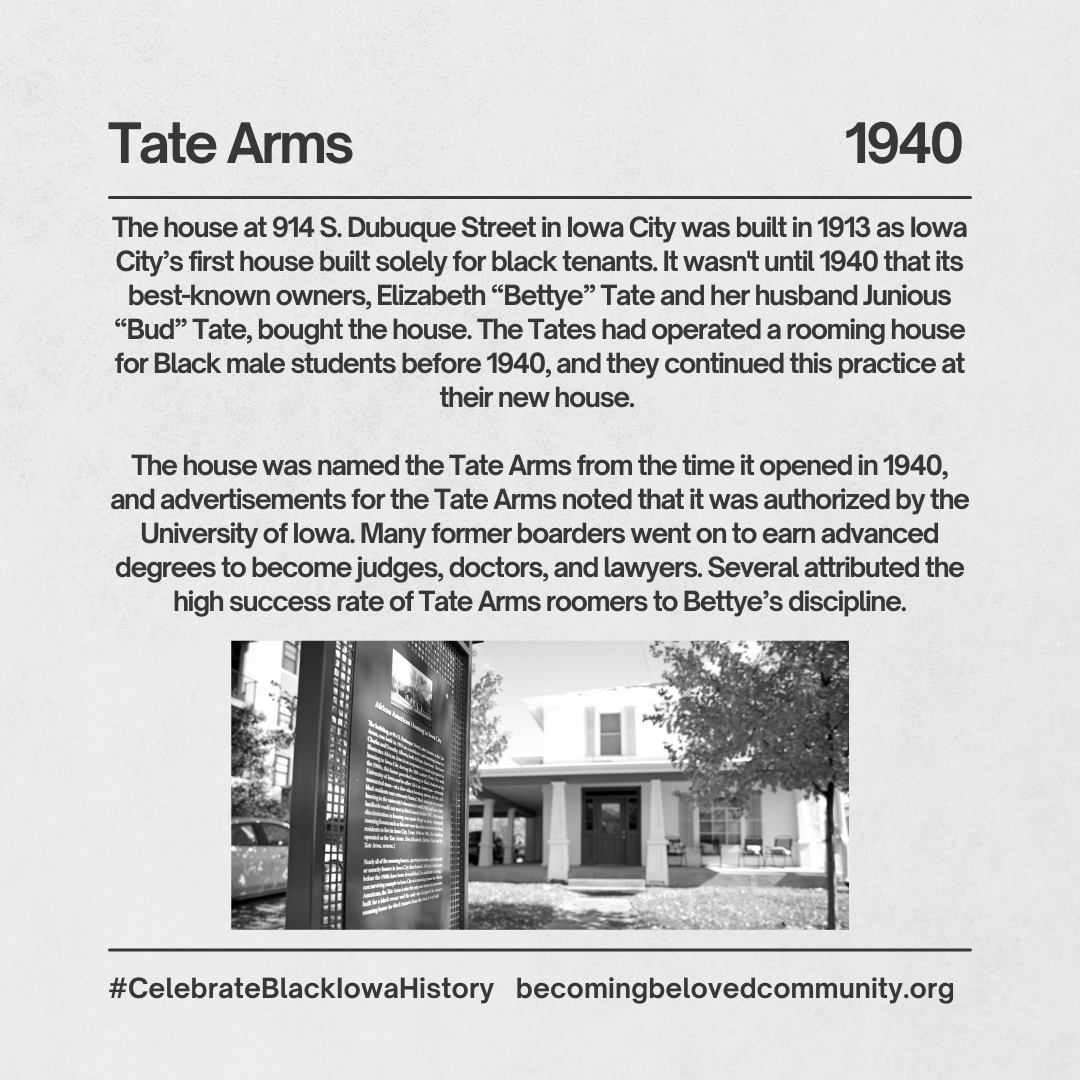 The house known as Tate Arms provided off-campus dormitory-style housing for African American students during a time when the University of Iowa barred them from living on campus and housing was difficult for Black students to find due to racial discrimination. Prior to the establishment of rooming houses for Black students such as the Iowa Federation Home and the Tate Arms, Black male students generally roomed with one of the few Black families in Iowa City or worked as servants in white fraternity houses. Black female students often obtained room and board in the households of university professors in exchange for performing household duties. Until African American students were allowed to live on campus, these two houses—and others like them that have since been demolished—provided a way for Black students to pursue their education in a racially segregated city. Many of the students who lived in these houses became active in the Civil Rights Movement during the mid-twentieth century.