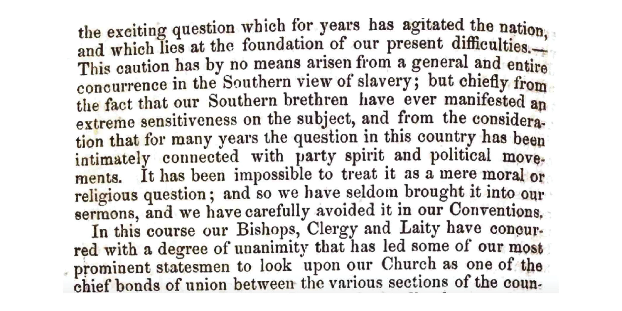 “Our Church, both in her pulpits and in her legislative bodies, has exercised great caution in regard to the exciting question which for years has agitated the nation and which lies at the foundation. of our present difficulties.—This caution has by no means arisen from a general and entire concurrence in the Southern view of slavery; but chiefly from the fact that our Southern brethren have ever manifested an extreme sensitiveness on the subJect, and from the consideration that for many years the question in this country has been intimately connected with party spirit and political movements. It has been impossible to treat it as a mere moral or religious question; and so we have seldom brought it into our sermons, and we have carefully avoided it in our Conventions…Differences of opinion have undoubtedly always existed amongst us upon the subject in question; but it has been so surrounded by difficulties, that, as a Church, we have not attempted to decide authoritatively concerning it. And even under the existing circumstances, a discussion of this subject, in its various phases and bearings, is not probably called for, in our pulpits and Conventions, by any practical benefit that would be likely to result from such a course. Our duty as Christian citizens, in the present exigency, seems to me to be wholly independent of this particular and very difficult question; although it can hardly be doubted that the contest now going on will do much towards modifying and deciding the general sentiment of the people in regard to the exciting cause of so unhappy a controversy. My own associations and habits of life have given me no capacity for viewing this question in the light in which it is viewed by our Southern brethren generally. All my sympathies and convictions are of a Northern tone and character. But at the same time I have concurred in the general opinion of our Church that this subject should not be allowed to divide us as it has divided some of the religious bodies in our land.” —Bishop Henry W. Lee. 1st Bishop of Iowa, Bishop’s Address to Convention, May 29-30, 1861